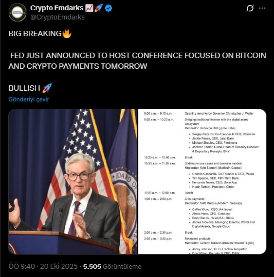 Öte yandan Fed güncel olarak 21 Ekim’de “Ödeme İnovasyon Konferansı” düzenleyeceğini açıkladı. Konferansın temelde stabilcoinler, dijital varlıklar ve yeni ödeme teknolojileri üzerine şekilleneceği açıkladı.