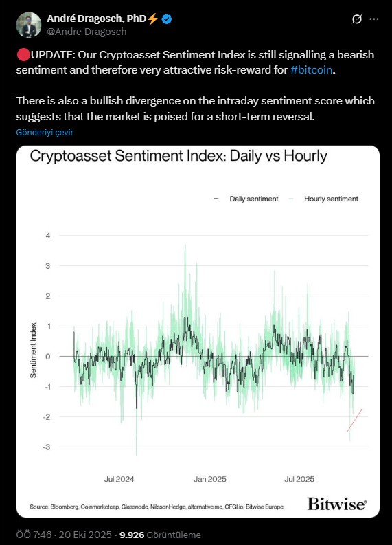 Bununla birlikte piyasa analistleri kısa vadeli toparlanmanın başladığını düşünüyor. Bitwise’dan André Dragosch, piyasa duygu endeksinin düşmesine rağmen yükseliş için piyasanın hazır olduğunu öne sürdü. Son sosyal medya gönderisinde kripto duygu endeksinin düşüş eğiliminde kaldığını açıkladı.