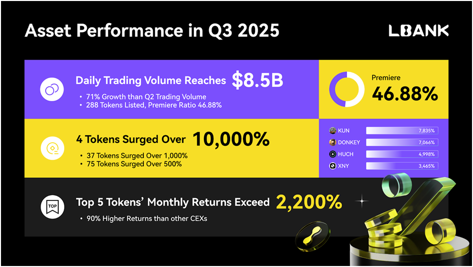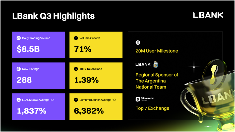 Singapur, 10 Ekim 2025 — LBank, önde gelen küresel bir kripto para borsası, bugün 2025 3. çeyrek performans raporunu yayınladı ve dinamik bir kripto piyasasında işlem hacminde güçlü büyüme, kullanıcı genişlemesi ve ekosistem ilerlemelerini vurguladı. LBank’ın 3. çeyrekteki ortalama günlük işlem hacmi 8,5 milyar dolara ulaştı, 2. çeyreğin 4,98 milyar dolarından çeyreklik (QoQ) %71 artış ve yıllık (YoY) %112,5 artış gösterdi. Bu sıçrama, platformun küresel kayıtlı kullanıcı sayısını 20 milyondan fazla yaparak, yatırımcıya olan çekiciliğini ve yenilikçi ortaklıklar ile özellikler aracılığıyla ana akım benimsenme momentumunu vurguladı.